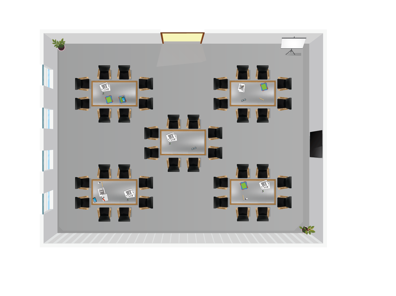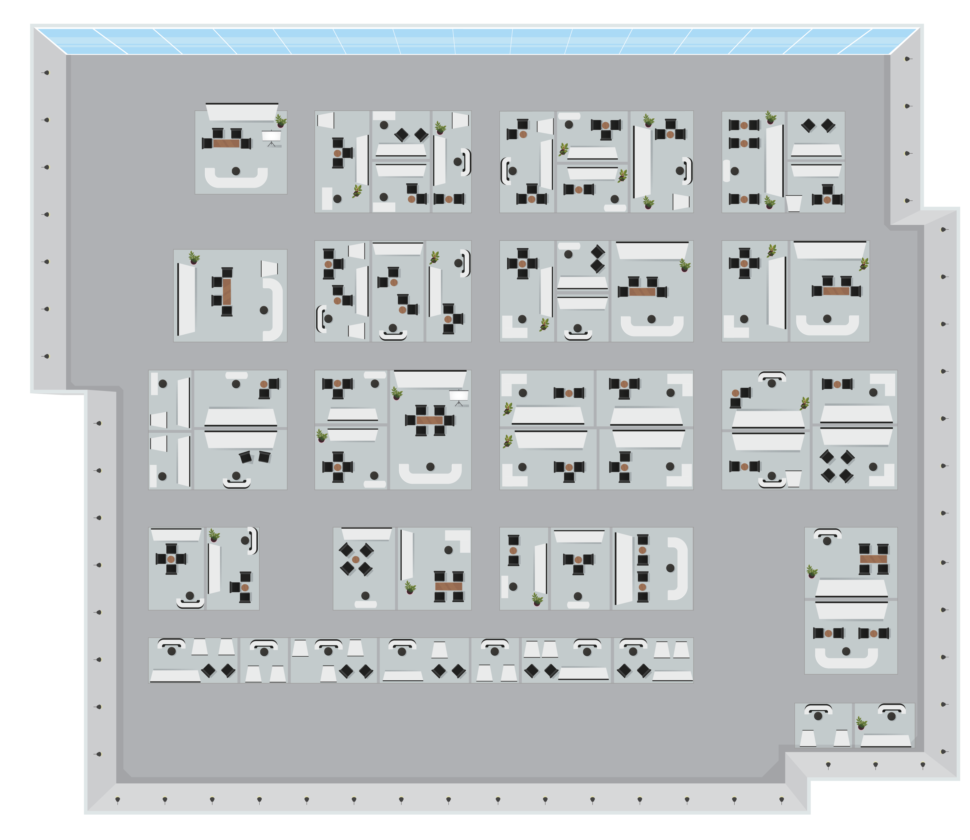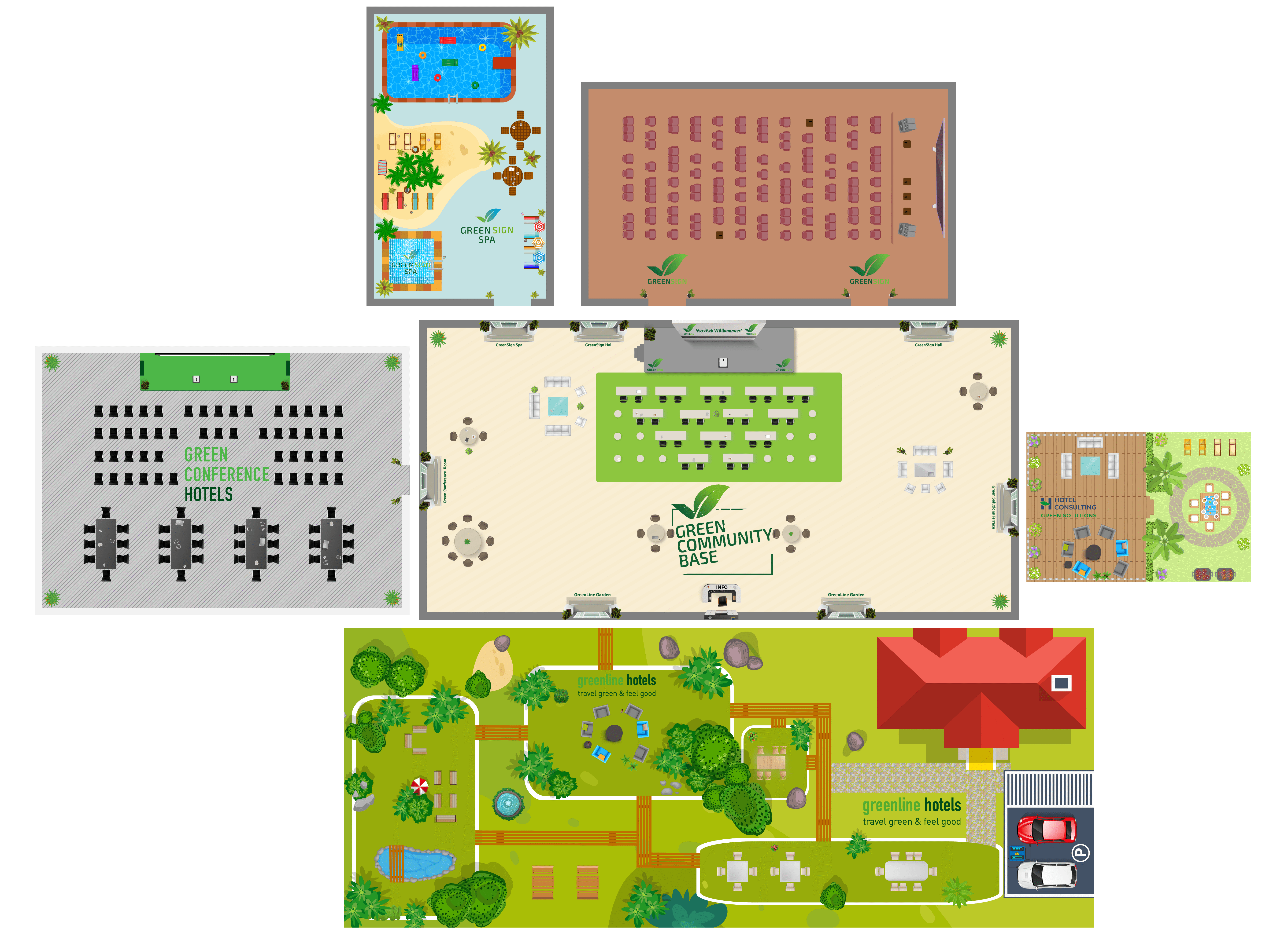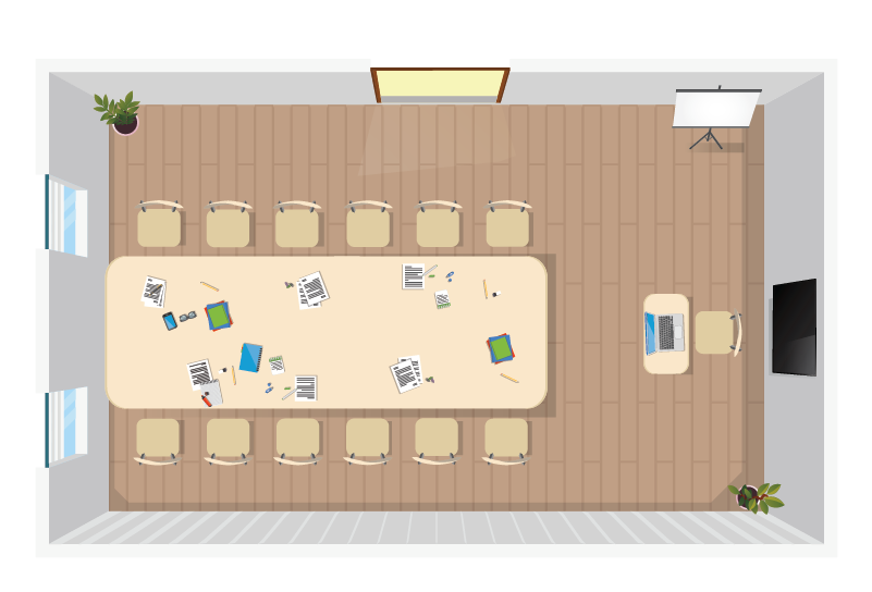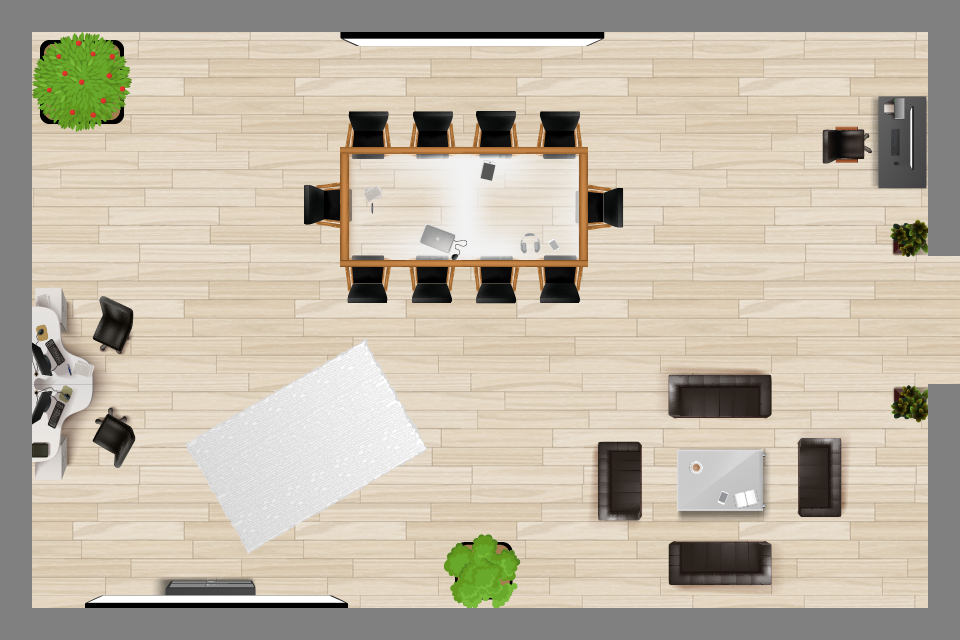 A: Jeder Raum beinhaltet ein gewisses Maß an Anpassung. Wir haben einige Standardvorlagen, die wir gerne mit kleinen Details wie z.B. deinem Firmenlogo anpassen, oder wir können einen neuen Raum von Grund auf entwerfen.