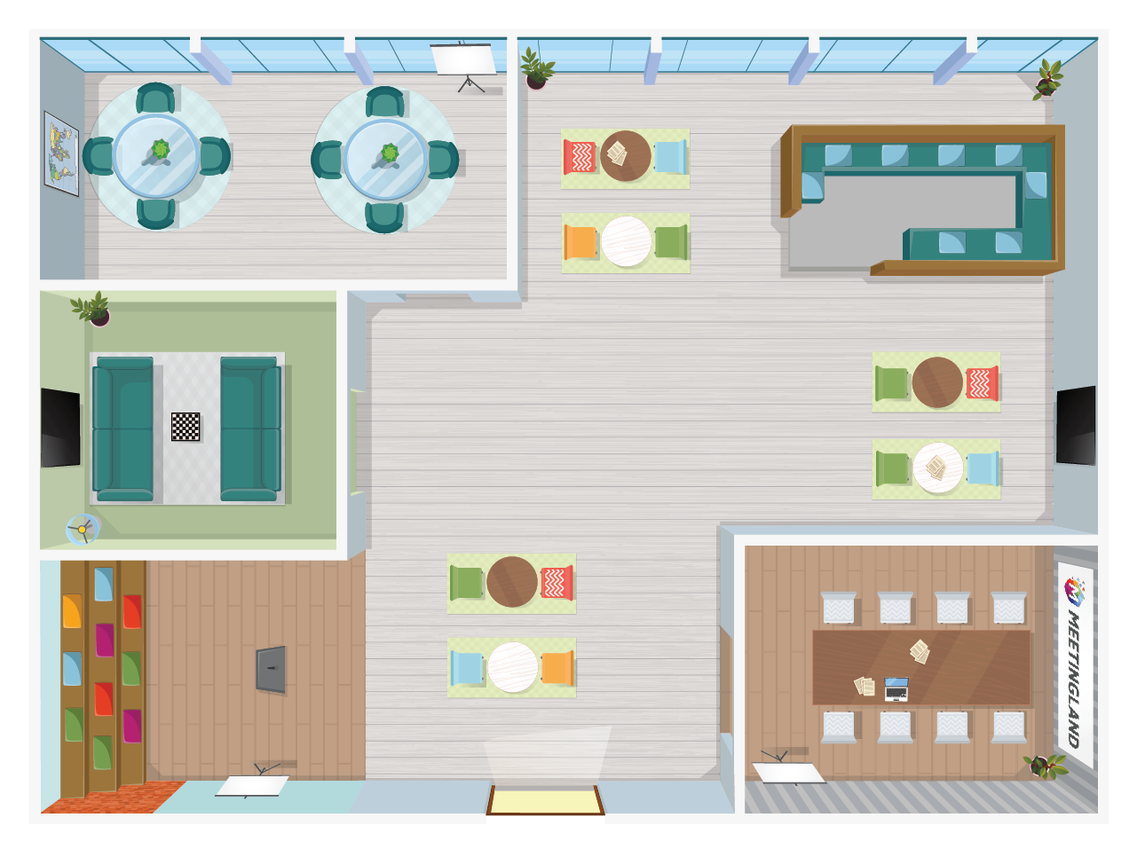 Viele Mitarbeiter und Kunden sind gelangweilt von Zoom, Skype oder Microsoft Teams Calls. Es fehlt schlichtweg an Flexibilität, sich spontan mit einzelnen Personen zu unterhalten oder sich der großen Gruppe für einen privaten Austausch zu entziehen. Es menschelt zu wenig, selbst Breakoutsessions sind nicht die Lösung. Meetingland bietet dir unterschiedliche virtuelle Büros im Stil von modernen CoWorking Spaces auf Basis der Gather Town Technologie. Gerne auch nach euren CI Vorgaben und mit individuellen Brandings!