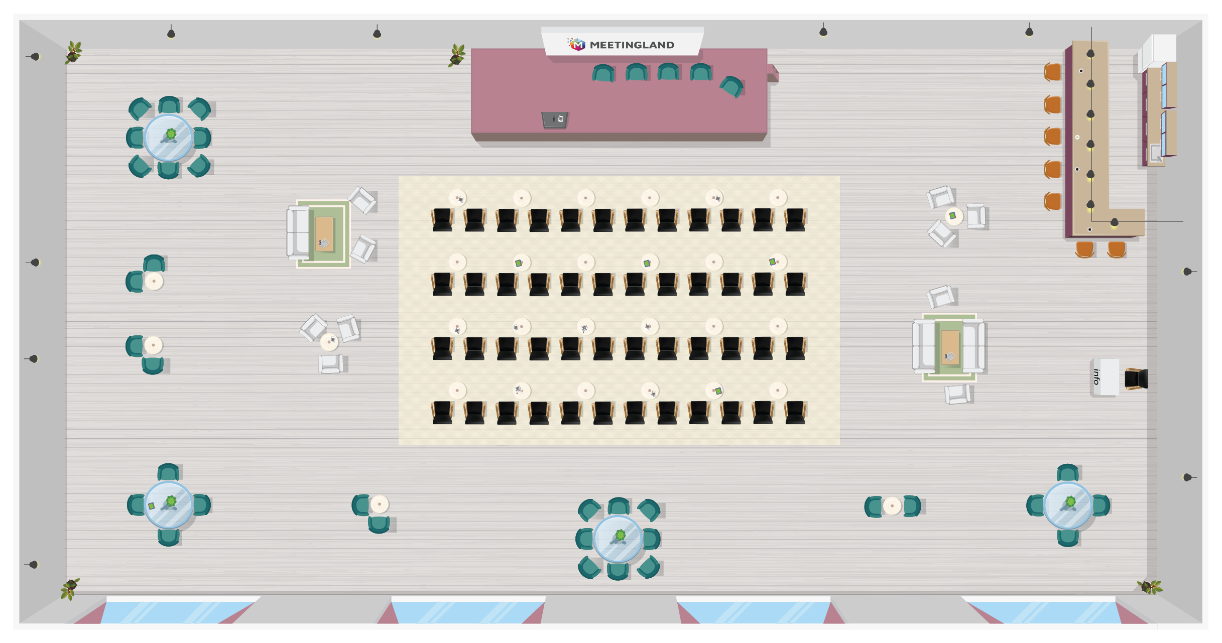 A: Wenn du dich für Meetingland entscheidest, um einen maßgeschneiderten Raum für deine Veranstaltung zu erstellen, kannst du ihn so oft wiederverwenden, wie du willst (zzgl. Lizenzkosten). Wir bieten auch vorgefertigte Räume an, die auf einer Einzel- oder Mehrzweckbasis tageweise gemietet werden können.